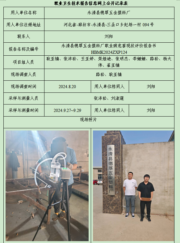 永清縣德厚五金塑料廠職業(yè)病危害現(xiàn)狀評價報告